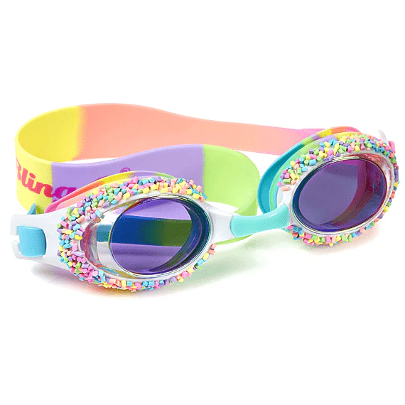 Bling2o Cake Pop Classic zwembril voor kinderen heeft een verstelbare band en glazen die niet condenseren, met prachtig gekleurde kunstsnoepjes rond de lenzen die passen bij de kleuren van de siliconen band en pakking.