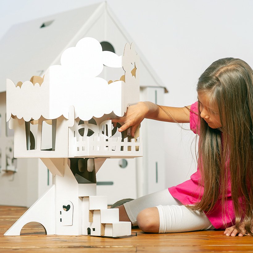 Dit is een prachtige, handgemaakte boomhut van wit karton.