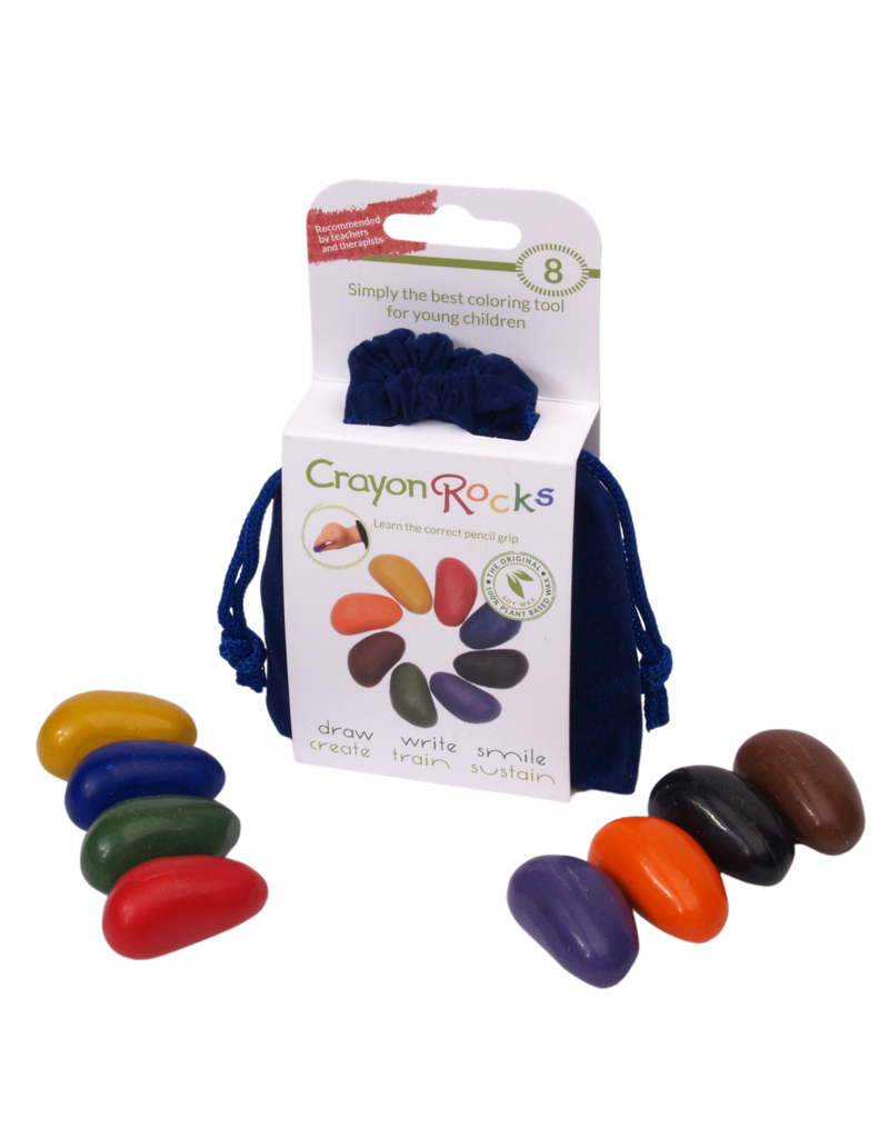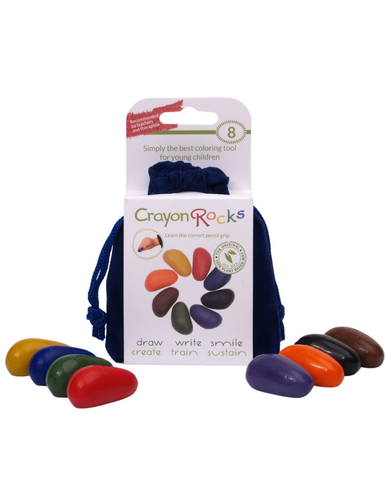 Blauw fluwelen zakje met acht (8) sojawaskrijtjes Crayon Rocks.