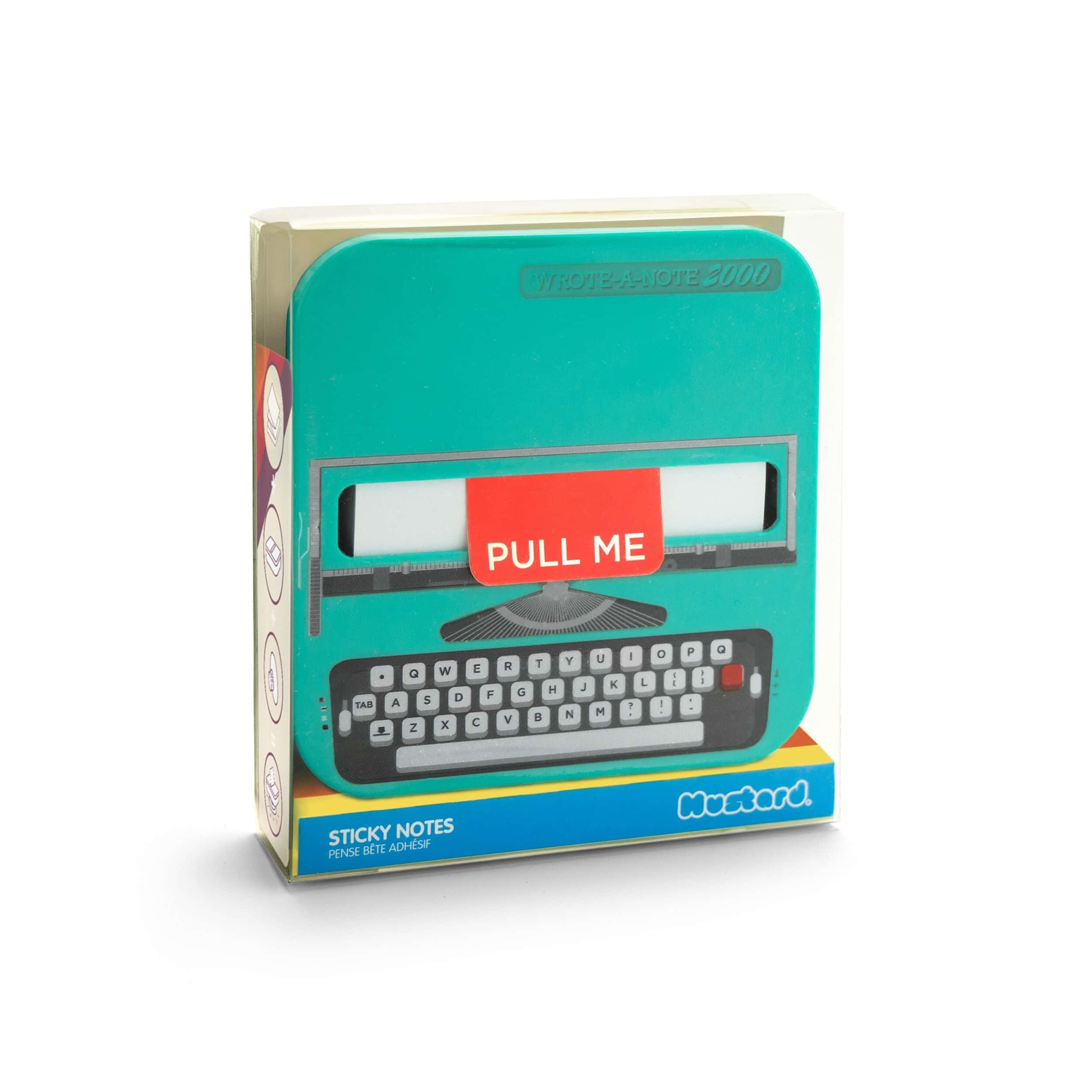 Een dispenser voor plakbriefjes in de vorm van een typemachine met plakbriefjes (100 vellen)