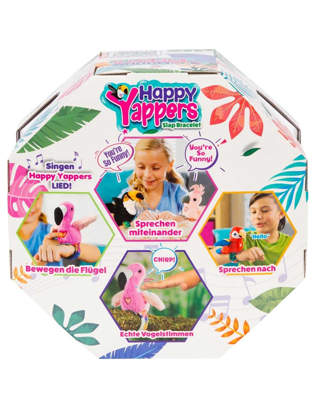 Ontdek het plezier van de Happy Yappers! Deze vrolijke pluchen vogeltjes reageren op je stem: ze herhalen woorden en geluiden, zingen een vrolijk liedje en bewegen daarbij hun vleugeltjes.