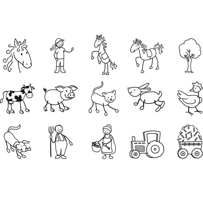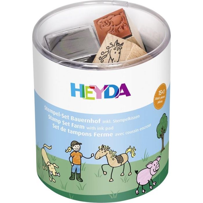 Ronde box gevuld met 15 houten stempels in het thema: “boerderij”.