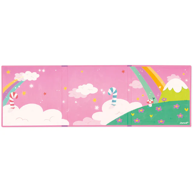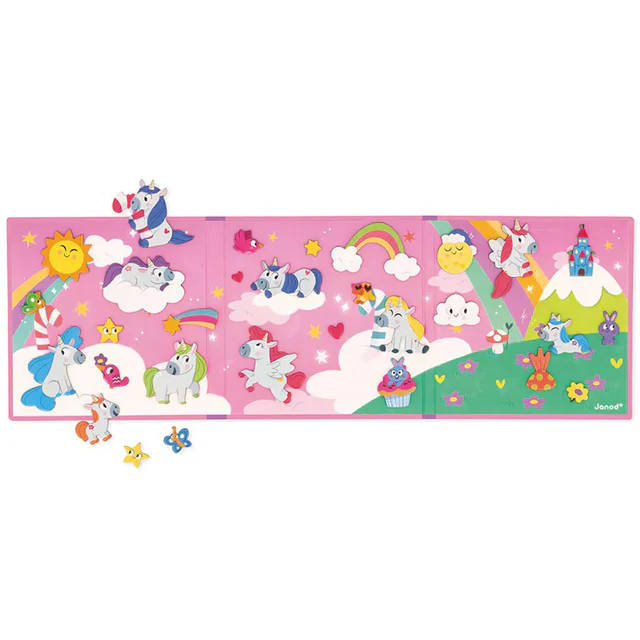 Plaats de magnetische eenhoorns op het geïllustreerde drieluiks en bedenk keer op keer een nieuw verhaal.