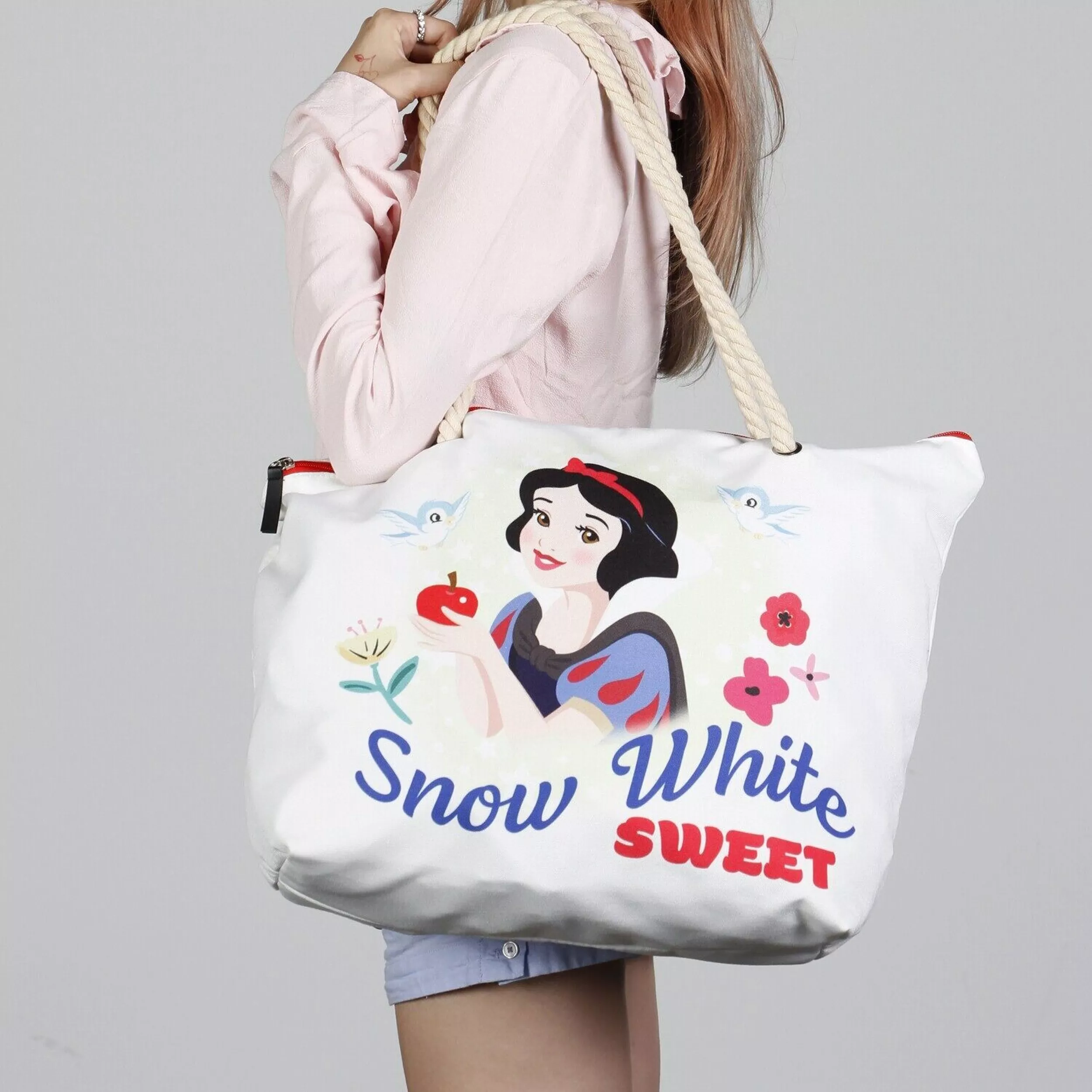 Maak je stranddagen extra lieflijk met de witte Sneeuwwitje strandtas! Deze ruime tas is voorzien van een charmant design van Sneeuwwitje en is perfect voor al je strandbenodigdheden. Het grote compartiment sluit veilig af met een rits, en de twee stevige handvatten zorgen ervoor dat je de tas comfortabel over je schouder of in je hand kunt dragen terwijl je geniet van de zon. Met de royale afmetingen van 52cm x 37cm x 17cm kun je alles meenemen wat je nodig hebt voor een heerlijke dag aan het strand of zwembad. Laat de betovering van Sneeuwwitje je vergezellen!