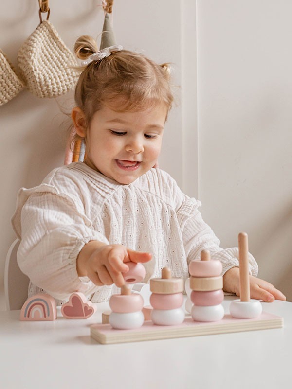Kinderen kunnen hun eigen spelletjes verzinnen en de ringen in kleurvolgorde stapelen, naast elkaar, de kleuren mengen, op de standaard of buiten de standaard, met figuren of zonder…
