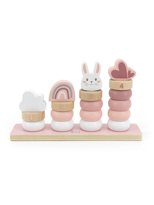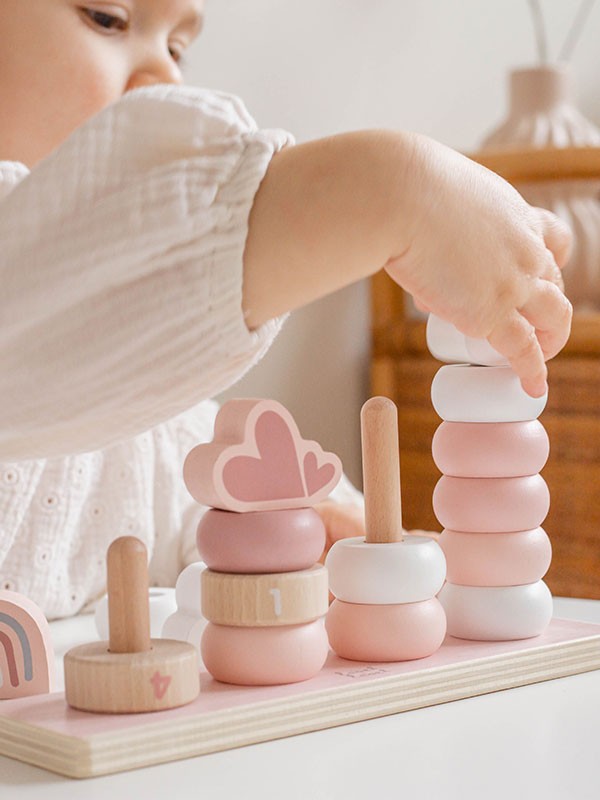 10 gekleurde stapelringen, 4 genummerde stapelringen en 4 Label Label-topblokken helpen je kind om te stapelen, sorteren en tellen,… en nog veel meer.