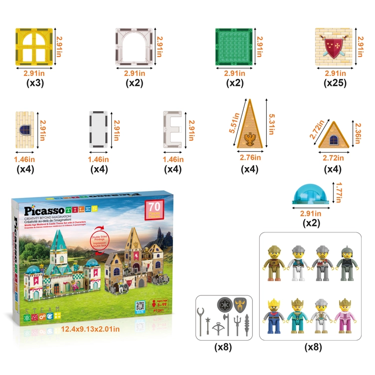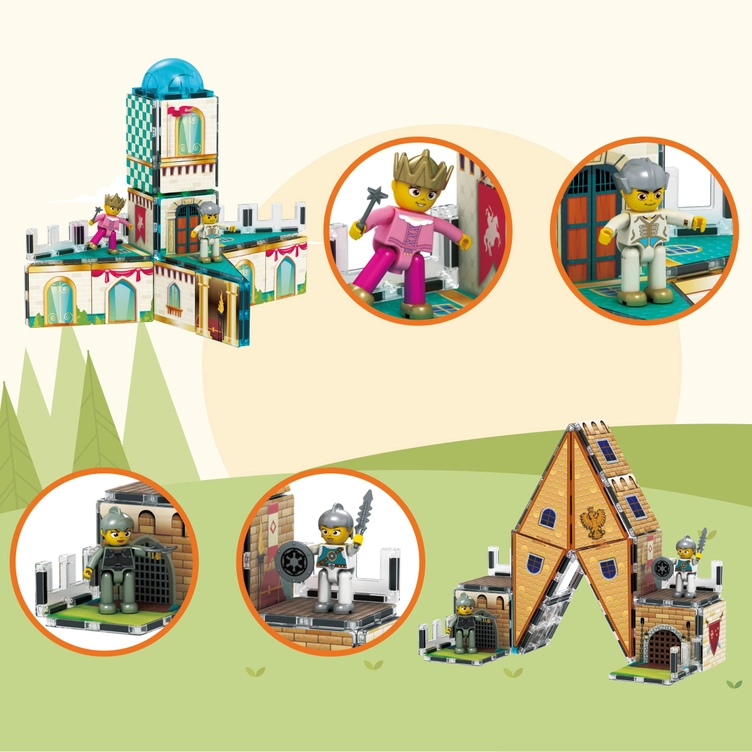 Ontdek de betovering van dubbele rijken met onze PicassoTiles 2-in-1 magneettegelset met kasteel en middeleeuws thema.
