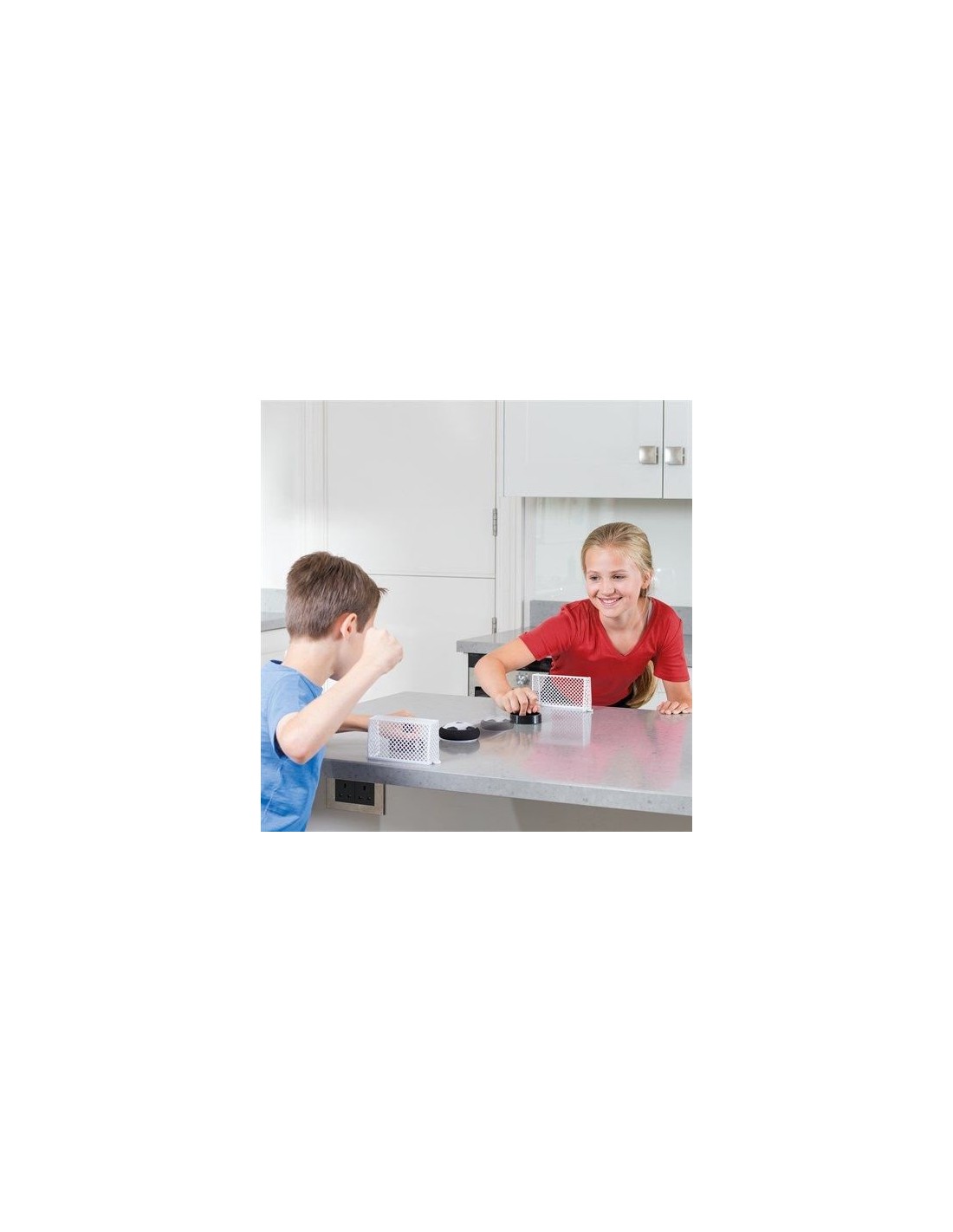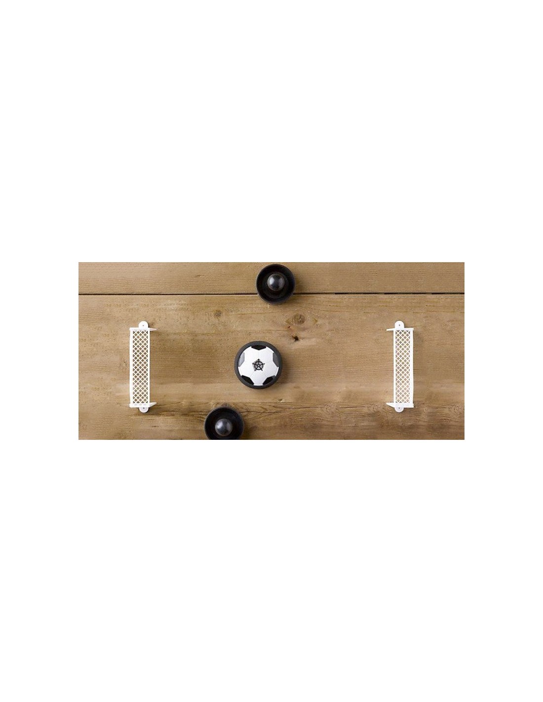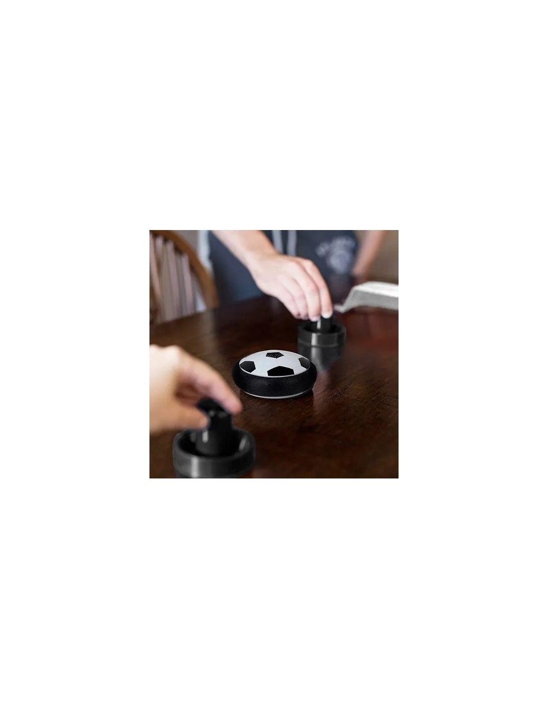Met de Tabletop Air Football-set voetbal spel voor binnen kun je elke gladde tafel als speelveld gebruiken, met behulp van een puck die over een luchtbed glijdt, twee gedempte spitsen en elke speler een zuignapdoel.