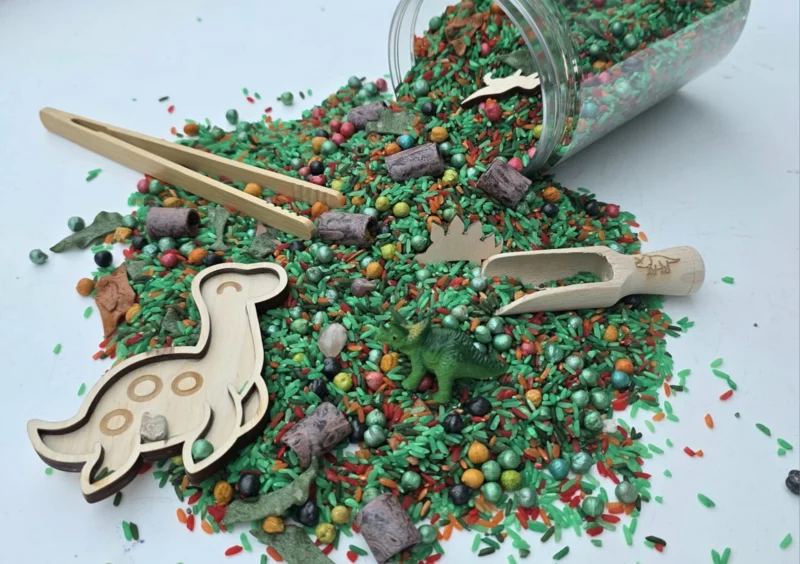 - Gemaakt van kikkererwten en Pasta geverfd met niet giftige acrylverf. En speelrijst gekleurd met azijn en voedselkleurstof.
