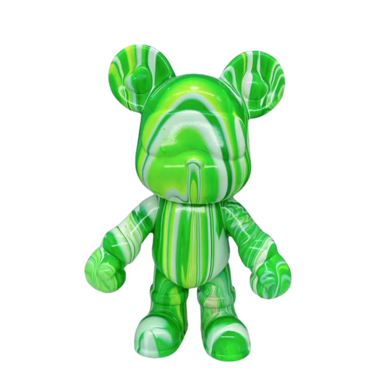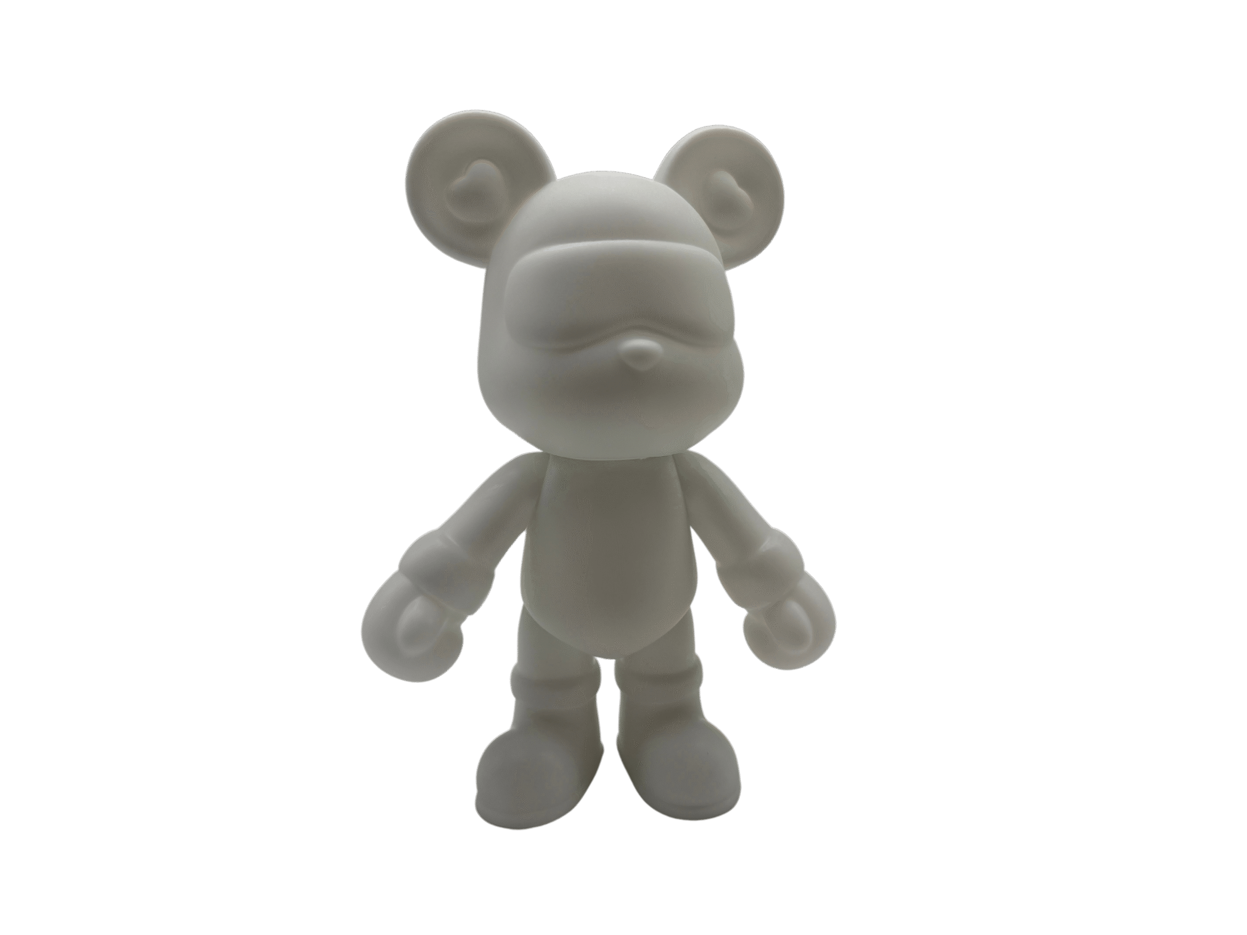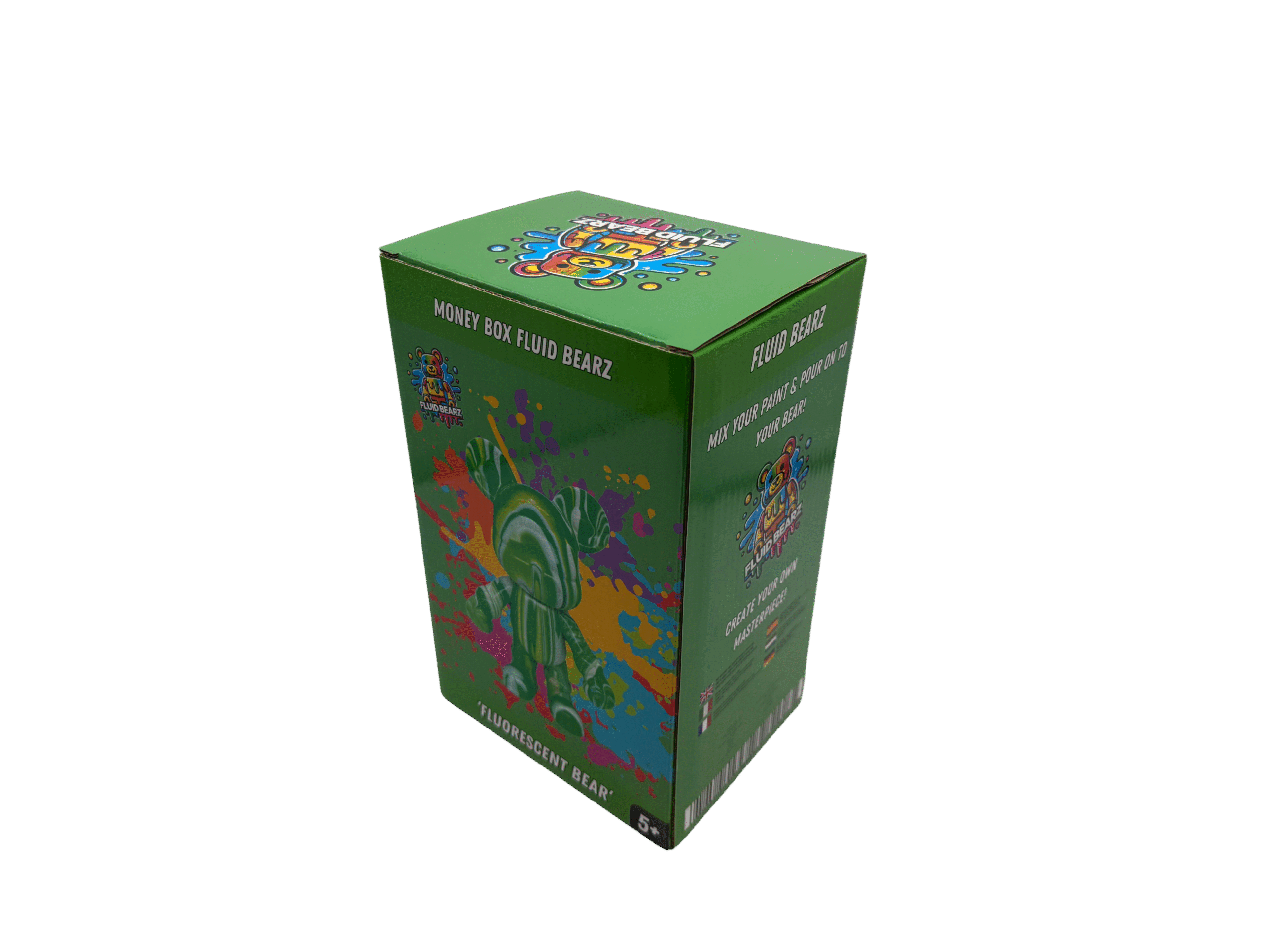 In de doos: Rabbit Fluid Bear (23 cm), 3 verschillende kleuren verf, palet, beker, handschoenen, penseel, lepel, tafelkleed en schort.