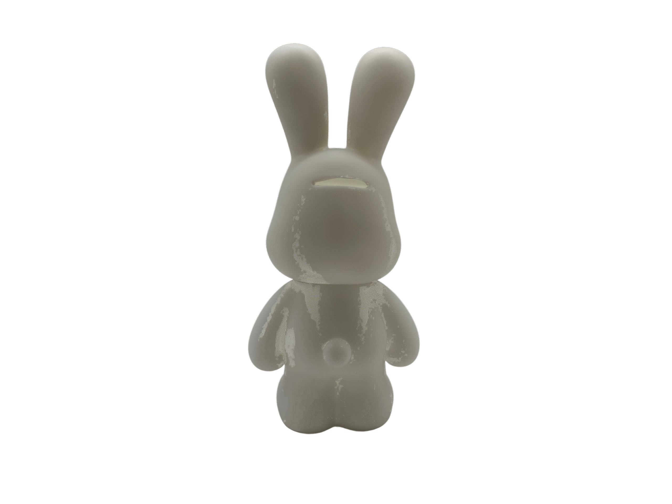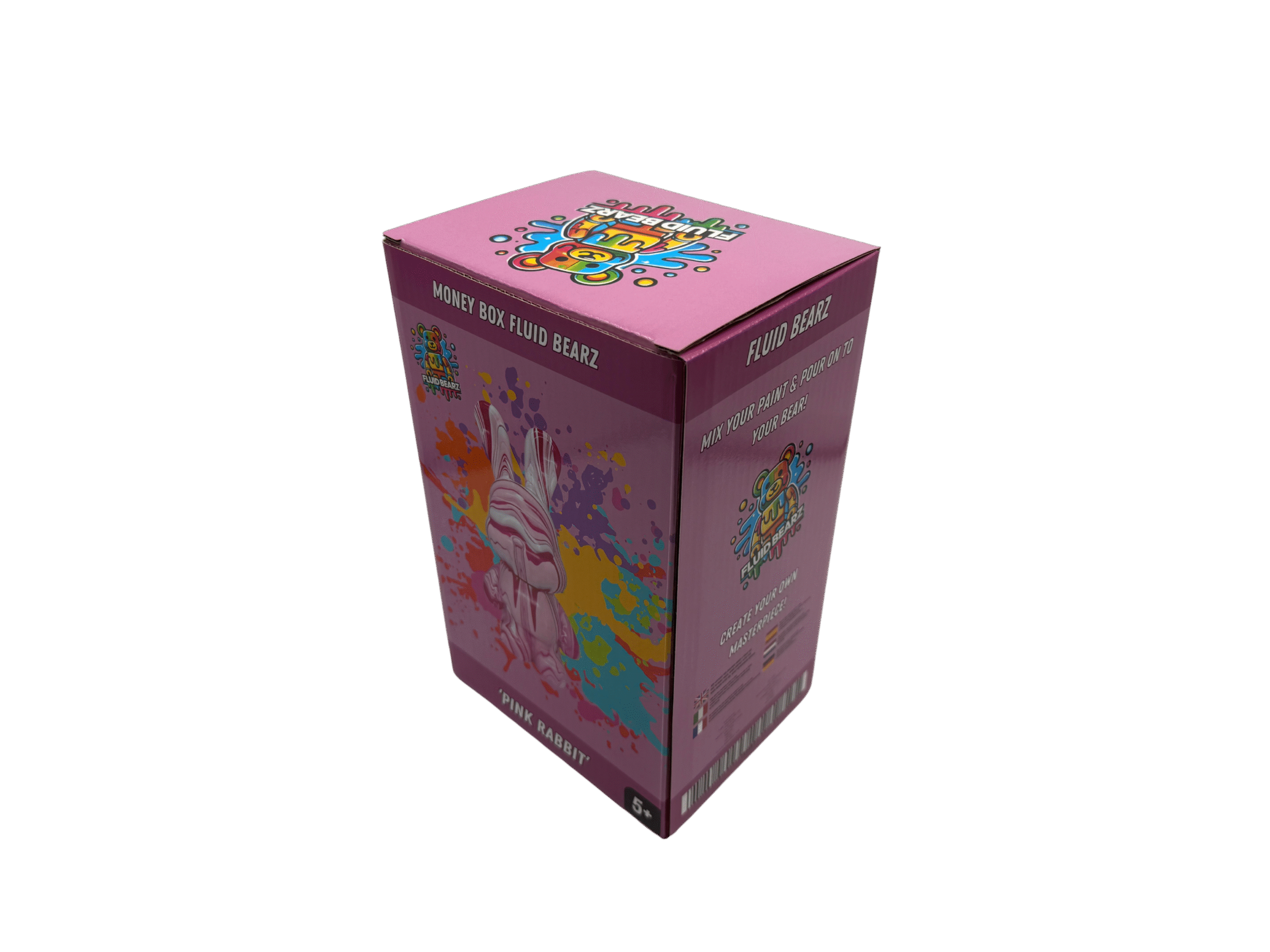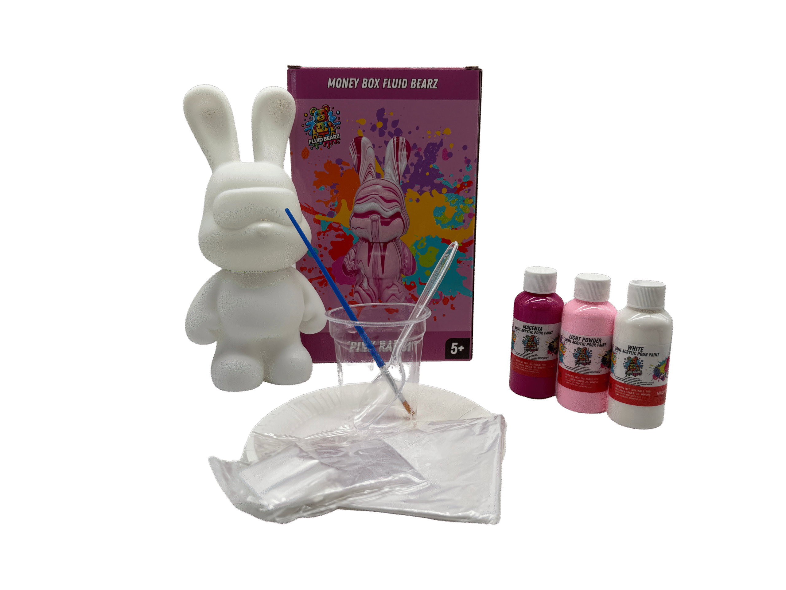 In de doos: Rabbit Fluid Bear (23 cm), 3 verschillende kleuren verf, palet, beker, handschoenen, penseel, lepel, tafelkleed en schort.