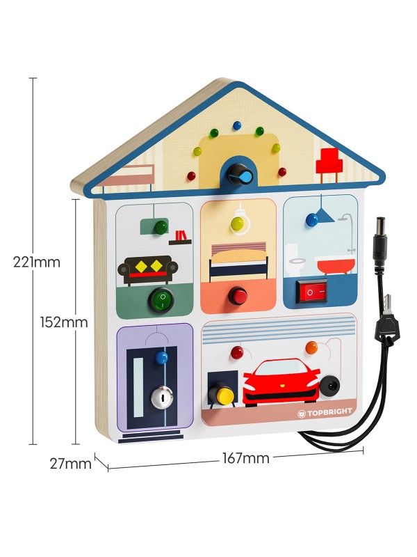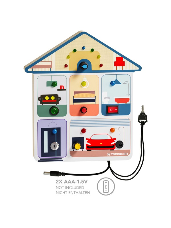 “Lights on! Met dit Busy Board leren kinderen spelenderwijs verschillende soorten lichtschakelaars gebruiken, net zoals volwassenen dat doen. Het kleine huisje is uitgerust met allerlei schakelaars om te duwen, draaien en kantelen.