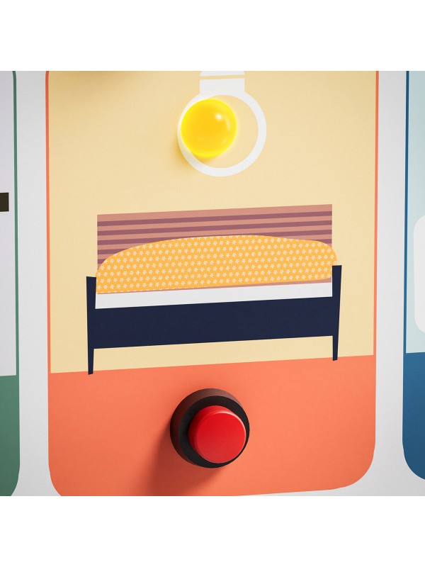 Elke schakelaar zorgt ervoor dat er een andere kamer in het huisje oplicht. De sleutel-schakelaar is de hoofdschakelaar: zodra het sleuteltje wordt omgedraaid, komt het bord tot leven en gaat er letterlijk een lichtje branden voor de kinderen.