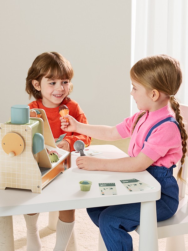Kinderen kunnen winkelier of klant spelen met deze interactieve houten ijsspeelset. Met een werkende ijsmachine, scooper, realistische bestelkaarten, speelgeld en kleurrijke toppings krijgen de kleintjes hands-on plezier tijdens het opbouwen van motorische vaardigheden en vroege wiskundige vaardigheden.