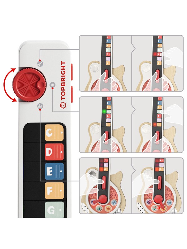 Draai aan de knop om verschillende instrumentklanken zoals piano, viool, trompet en drums te verkennen om luistervaardigheden en nieuwsgierigheid op te bouwen.
