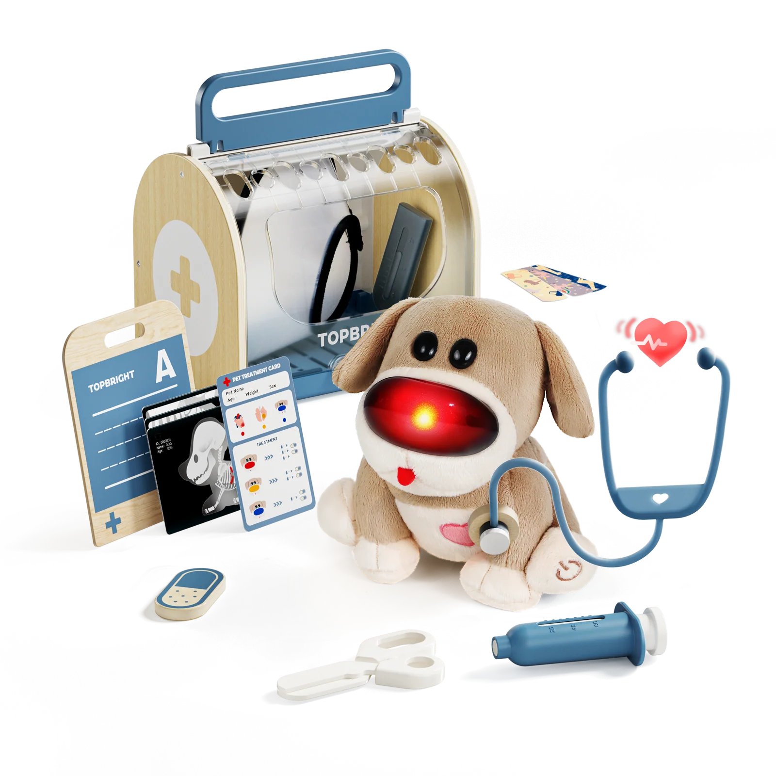 Kinderen kunnen hun harige vriend behandelen met behulp van leuke hulpmiddelen zoals een stethoscoop, spuit, thermometer en diagnosekaart, waardoor een echte praktische ervaring ontstaat.