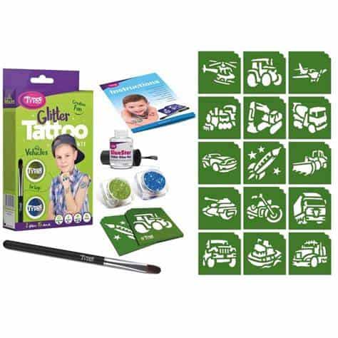 Leuke set glitter tattoo. De set bevat maar liefst 15 tattoo-sjablonen. Deze omvatten: voertuigen